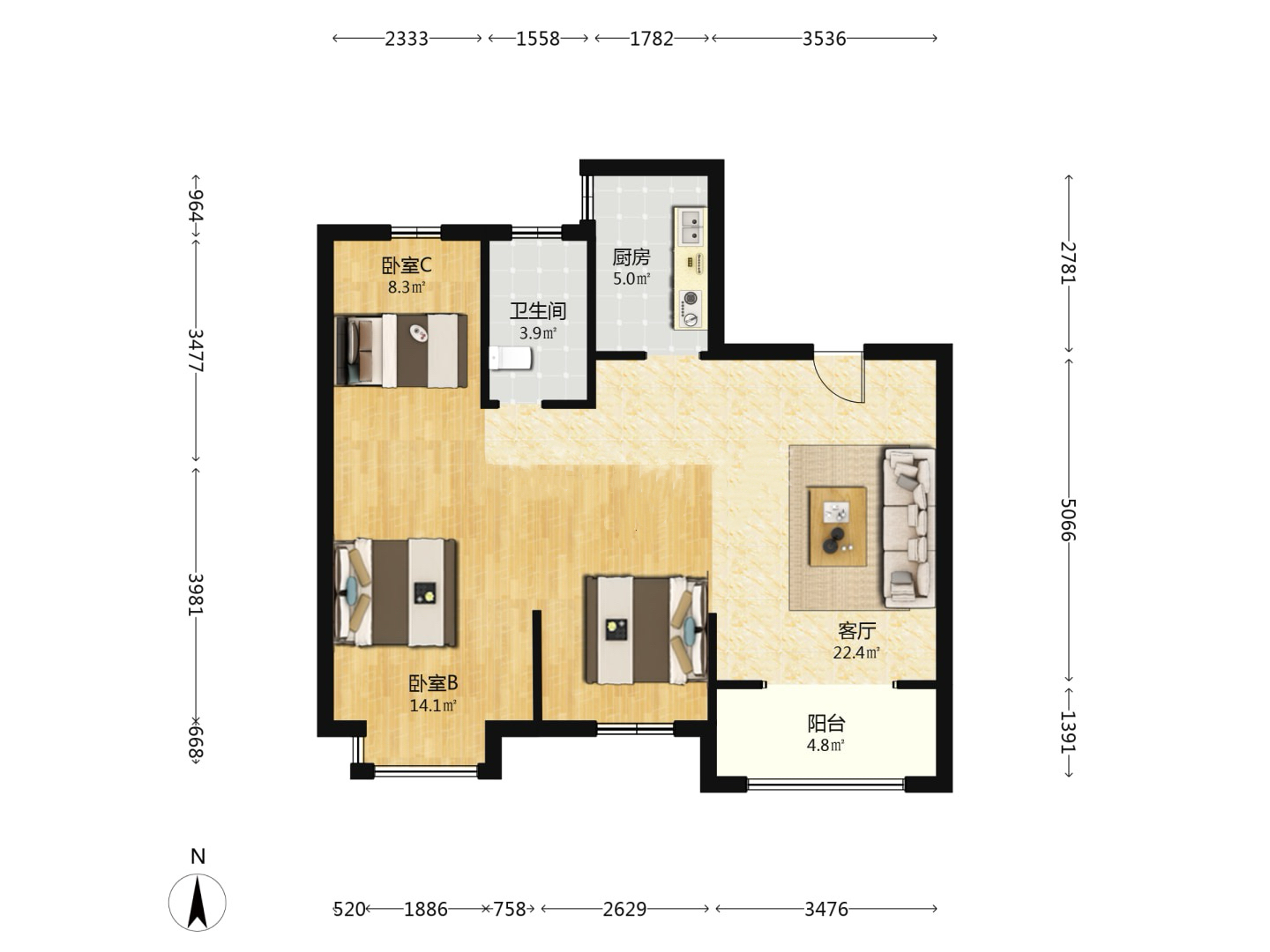 3室2厅1卫1厨 · 93.97㎡ 52.8万